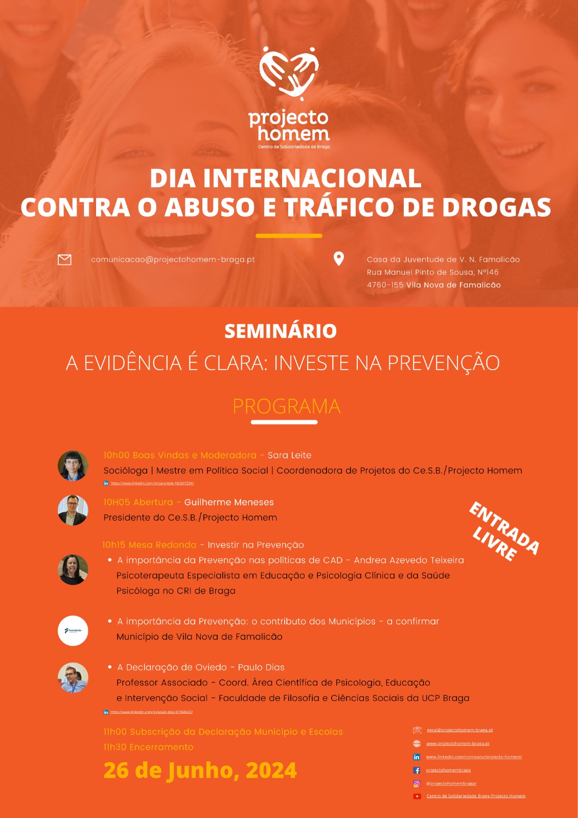 O Projecto Homem vai assinalar o Dia Internacional contra o Abuso e Tráfico de Drogas com um seminário na Casa da Juventude de Famalicão.