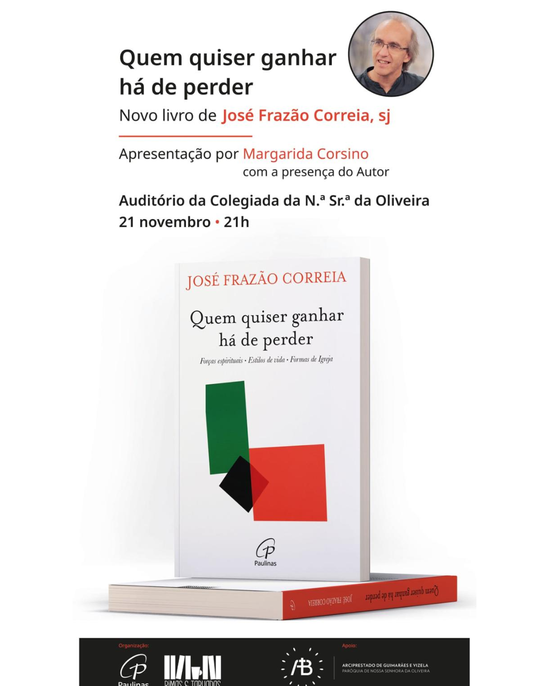 O livro “Quem quiser ganhar, há de perder – forças espirituais, estilos de vida, formas de Igreja”, do P. José Frazão Correia, editado pelas Paulinas, será apresentado, na sexta-feira, dia 21, às 21h, no Auditório da Colegiada da Nossa Senhora da Oliveira, no coração do centro histórico de Guimarães.