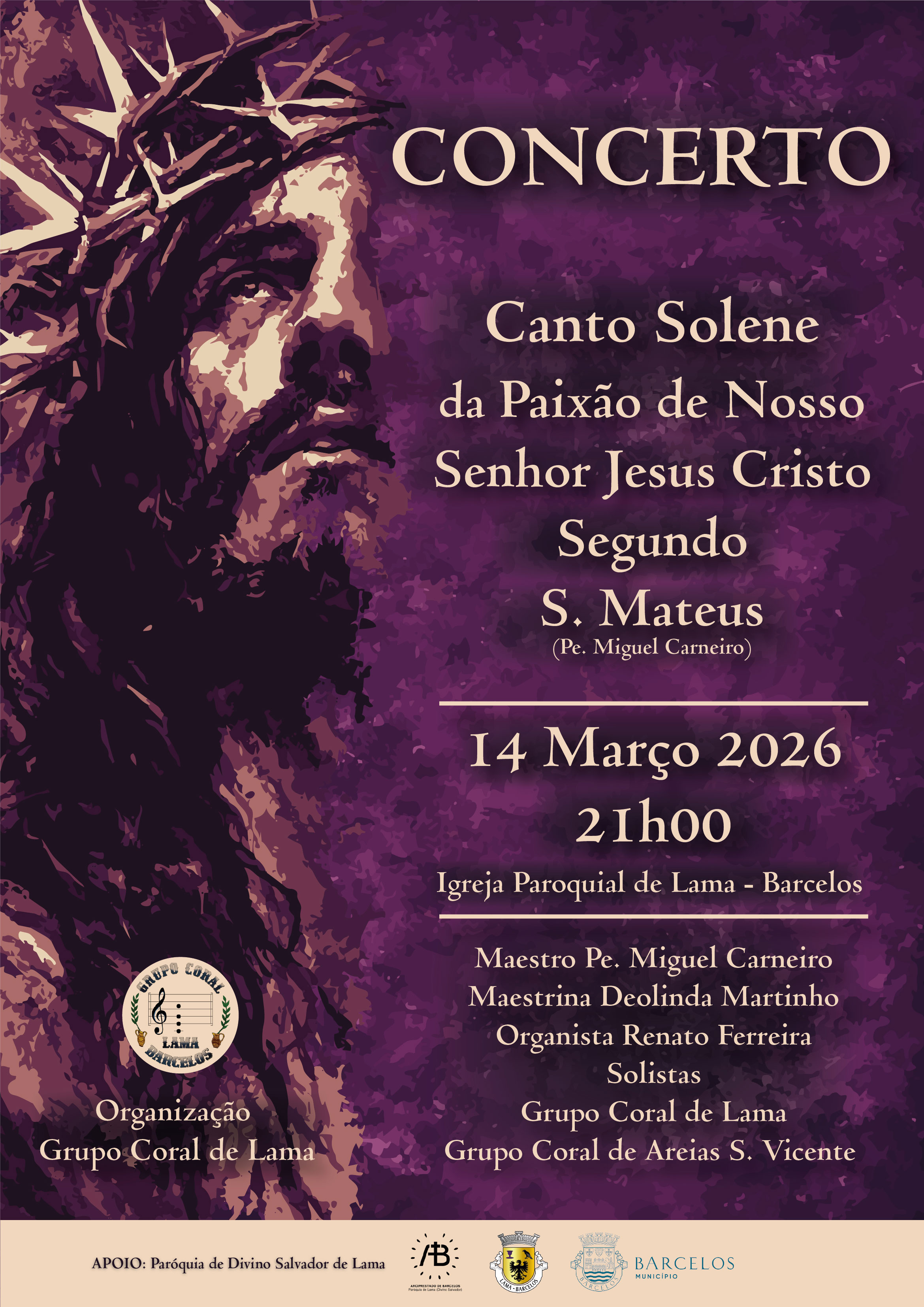 O coro interpretará a obra “Paixão de Nosso Senhor Jesus Cristo, Segundo São Mateus”, da autoria do Padre Miguel Carneiro. Escrita para solistas, órgão e coro, a composição será apresentada com a participação de cantores profissionais e dos coros de Lama e de Areias S. Vicente.