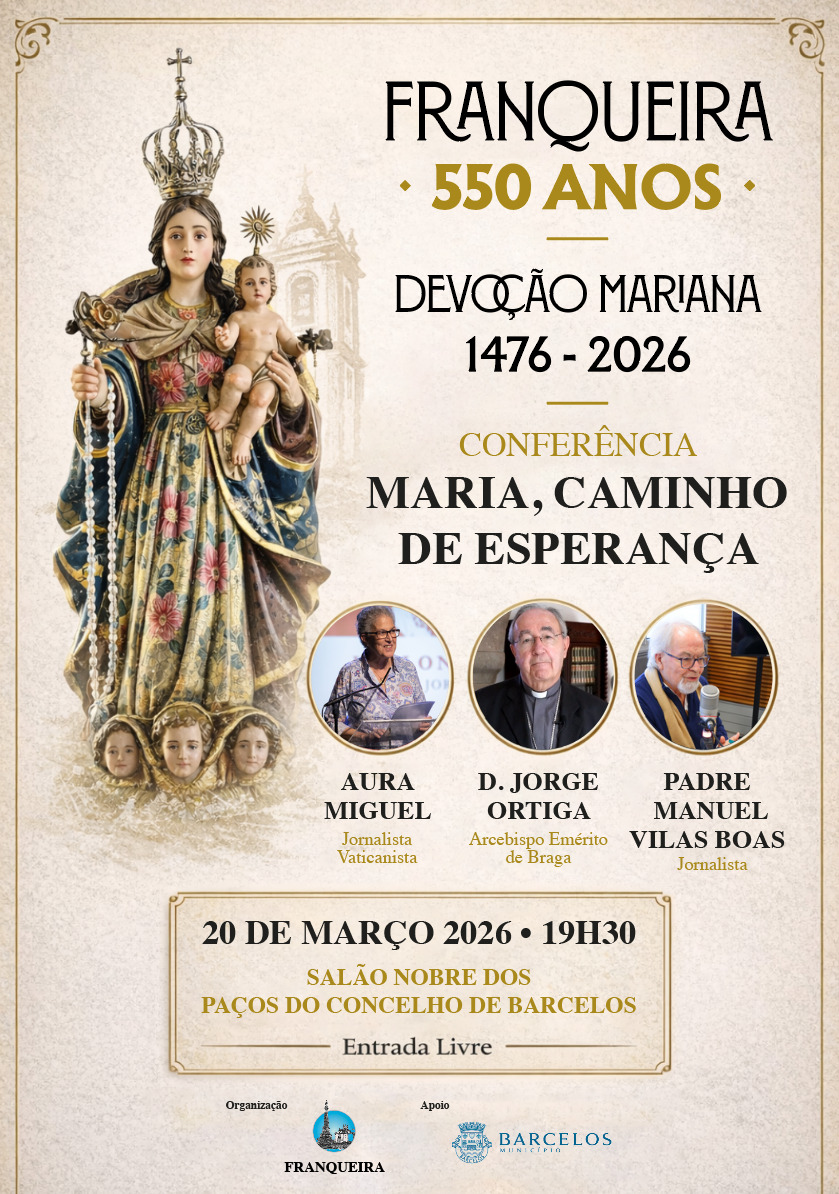 No âmbito das comemorações “Franqueira – 550 Anos de Devoção Mariana (1476–2026)”, terá lugar em Barcelos, no próximo dia 20 de março, às 19h30, no Salão Nobre dos Paços do Concelho (antiga Igreja do Hospital do Espírito Santo), a 2.ª Conferência do Ciclo Comemorativo, subordinada ao tema: “Maria, Caminho de Esperança” - Devoção Mariana entre o Magistério da Igreja, a Vivência do Povo e os Desafios do Presente.