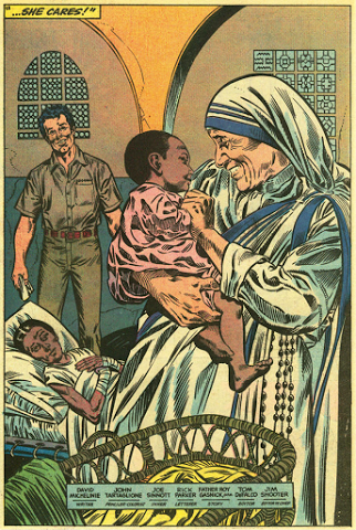 Importa recordar que no ano de 1984, a famosa empresa de animação Marvel deu um importante passo na representação dos grandes heróis. Foi neste período que olharam Madre Teresa Calcutá como uma autêntica heroína da vida real. Olhada como a grande Santa dos pobres, cedo se destacou no auxílio prestado aos mais vulneráveis e marginalizados pela sociedade contemporânea.