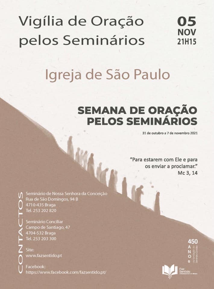 Neste mês de novembro, e em plena Semana de Oração pelos Seminários, no habitual Momento Mensal de Oração pela Vida e Vocações, os Seminários Arquidiocesanos de Braga estão a preparar uma Vigília de Oração pelos Seminários, que decorrerá na próxima sexta-feira, dia 5, às 21h15, na Igreja de S. Paulo, no Seminário Conciliar, em Braga.