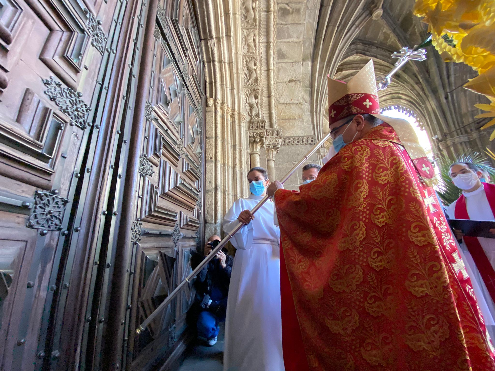 Viemos em procissão com os ramos benzidos e antes de entrarmos na Catedral, numa particularidade litúrgica da nossa Igreja bracarense, bati com a própria Cruz primacial na porta, que se abriu como símbolo de Jesus Cristo, a Porta das portas da vida eterna. Ao mesmo tempo, lançamos as folhas de oliveira à cruz, sinal da paz e da reconciliação. A cruz abre a porta da vida plena. A Páscoa e a cruz interligam-se.