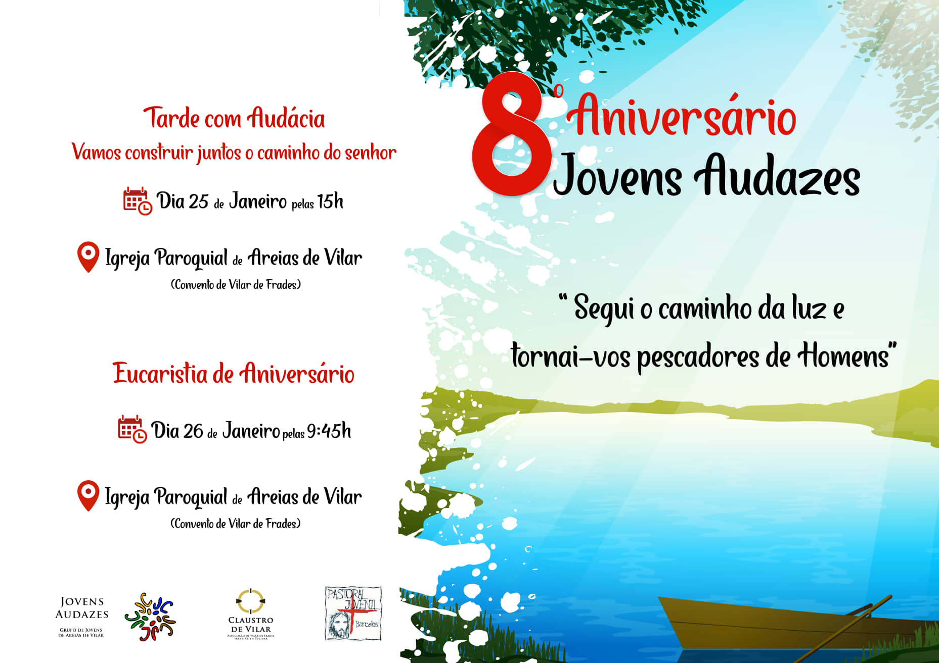 15 janeiro 2020 Notícia A. "Jovens Audazes" celebram oitavo aniversário Eucaristia de aniversário é celebrada no dia 26, às 09h45, na igreja paroquial de Areias de Vilar.