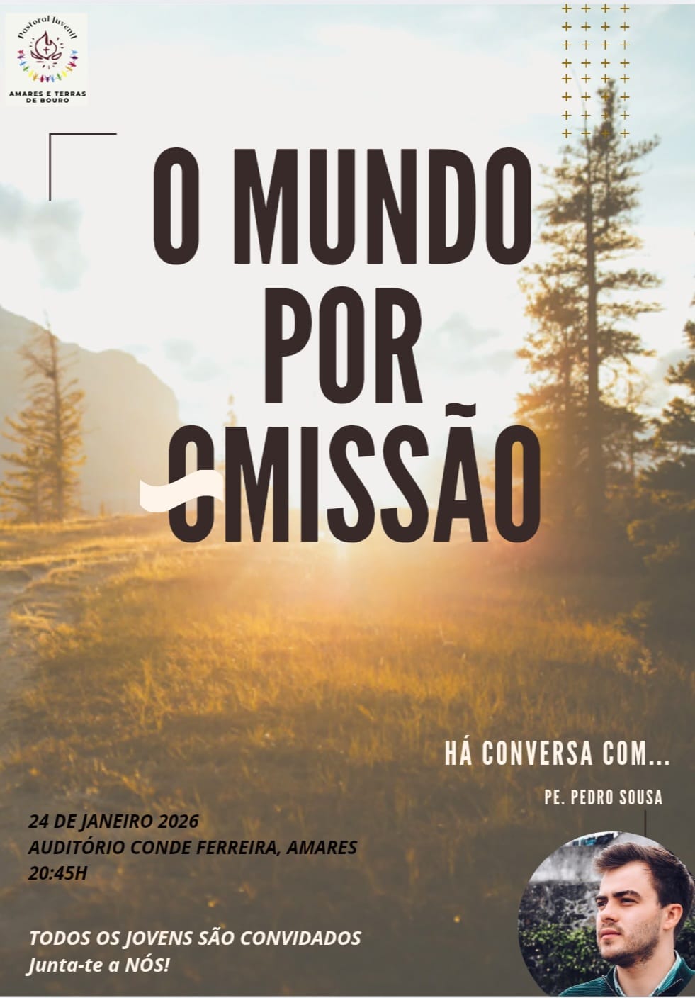 A Pastoral Juvenil de Amares e Terras de Bouro promove, no dia 24 de janeiro, pelas 20.45h no Auditório Conde Ferreira em Amares, uma tertúlia com o convidado Padre Pedro Sousa intitulada "O mundo por "o"missão".