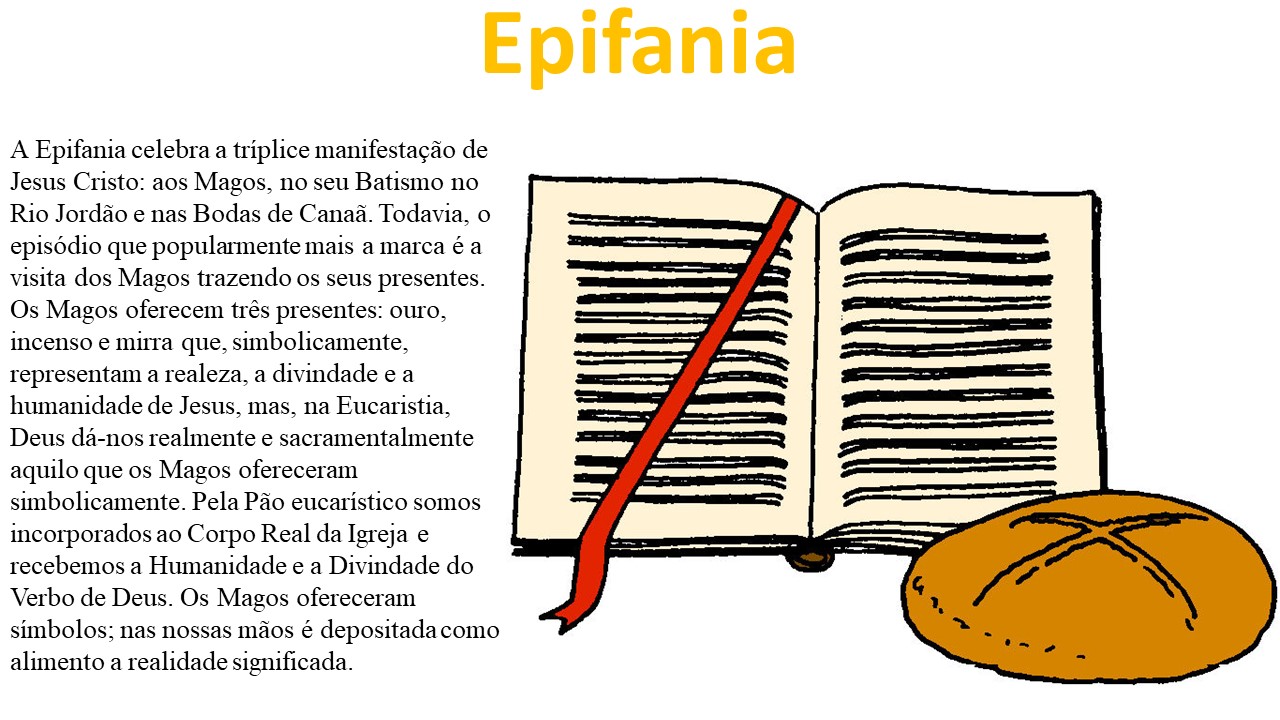 A Epifania celebra a tríplice manifestação de Jesus Cristo: aos Magos, no seu Batismo no Rio Jordão e nas Bodas de Canaã. Todavia, o episódio que popularmente mais a marca é a visita dos Magos, trazendo os seus presentes. Os Magos oferecem três presentes: ouro, incenso e mirra, que, simbolicamente, representam a realeza, a divindade e a humanidade de Jesus, mas, na Eucaristia, Deus dá-nos realmente e sacramentalmente aquilo que os Magos ofereceram simbolicamente. Pelo Pão eucarístico somos incorporados ao Corpo Real da Igreja e recebemos a Humanidade e a Divindade do Verbo de Deus. Os Magos ofereceram símbolos; nas nossas mãos é depositada como alimento a realidade significada.