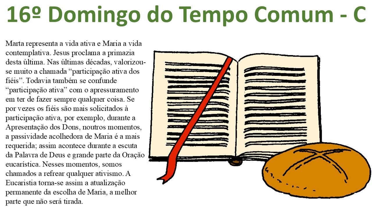 Nas leituras deste Domingo, encontramos três modelos de acolhimento: Abraão, Marta e Maria. Abraão está atento, partilha tudo o que tem e encontra no hóspede que entra na sua tenda a figura do próprio Cristo. Marta e Maria acolhem Jesus em sua casa: Marta mais preocupada em que nada falte para o acolhimento do Mestre, Maria escolhe a melhor parte, colocando-se aos pés de Jesus, disponível para escutar a sua Palavra.
