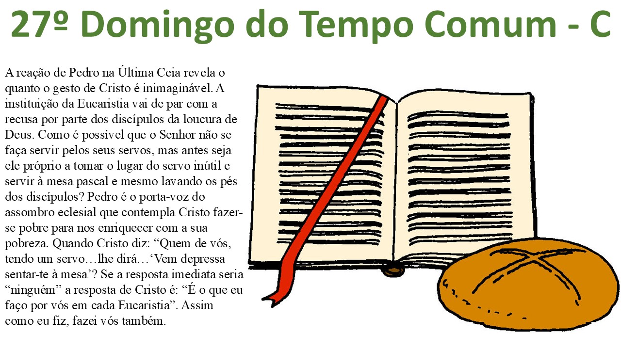 A reação de Pedro na Última Ceia revela o quanto o gesto de Cristo é inimaginável. A instituição da Eucaristia vai a par com a recusa por parte dos discípulos da loucura de Deus. Como é possível que o Senhor não se faça servir pelos seus servos, mas antes seja ele próprio a tomar o lugar do servo inútil e servir à mesa pascal e mesmo lavando os pés dos discípulos? Pedro é o porta-voz do assombro eclesial que contempla Cristo fazer-se pobre para nos enriquecer com a sua pobreza. Quando Cristo diz: “quem de vós, tendo um servo… lhe dirá… ‘vem depressa sentar-te à mesa’?”. Se a resposta imediata seria “ninguém”, a resposta de Cristo é: “é o que eu faço por vós em cada Eucaristia”. Assim como eu fiz, fazei vós também.
