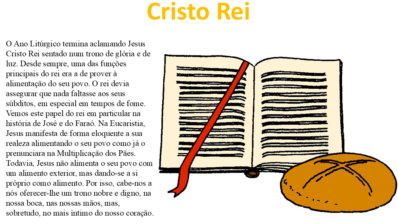 O Ano Litúrgico termina aclamando Jesus Cristo Rei, sentado num trono de glória e de luz. Desde sempre, uma das funções principais do rei era a de prover à alimentação do seu povo. O rei devia assegurar que nada faltasse aos seus súbditos, em especial em tempos de fome. Vemos este papel do rei em particular na história de José e do Faraó. Na Eucaristia, Jesus manifesta de forma eloquente a sua realeza, alimentando o seu povo como já o prenunciara na multiplicação dos pães. Todavia, Jesus não alimenta o seu povo com um alimento exterior, mas dando-se a si próprio como alimento. Por isso, cabe-nos a nós oferecer-lhe um trono nobre e digno, na nossa boca, nas nossas mãos, mas, sobretudo, no mais íntimo do nosso coração.