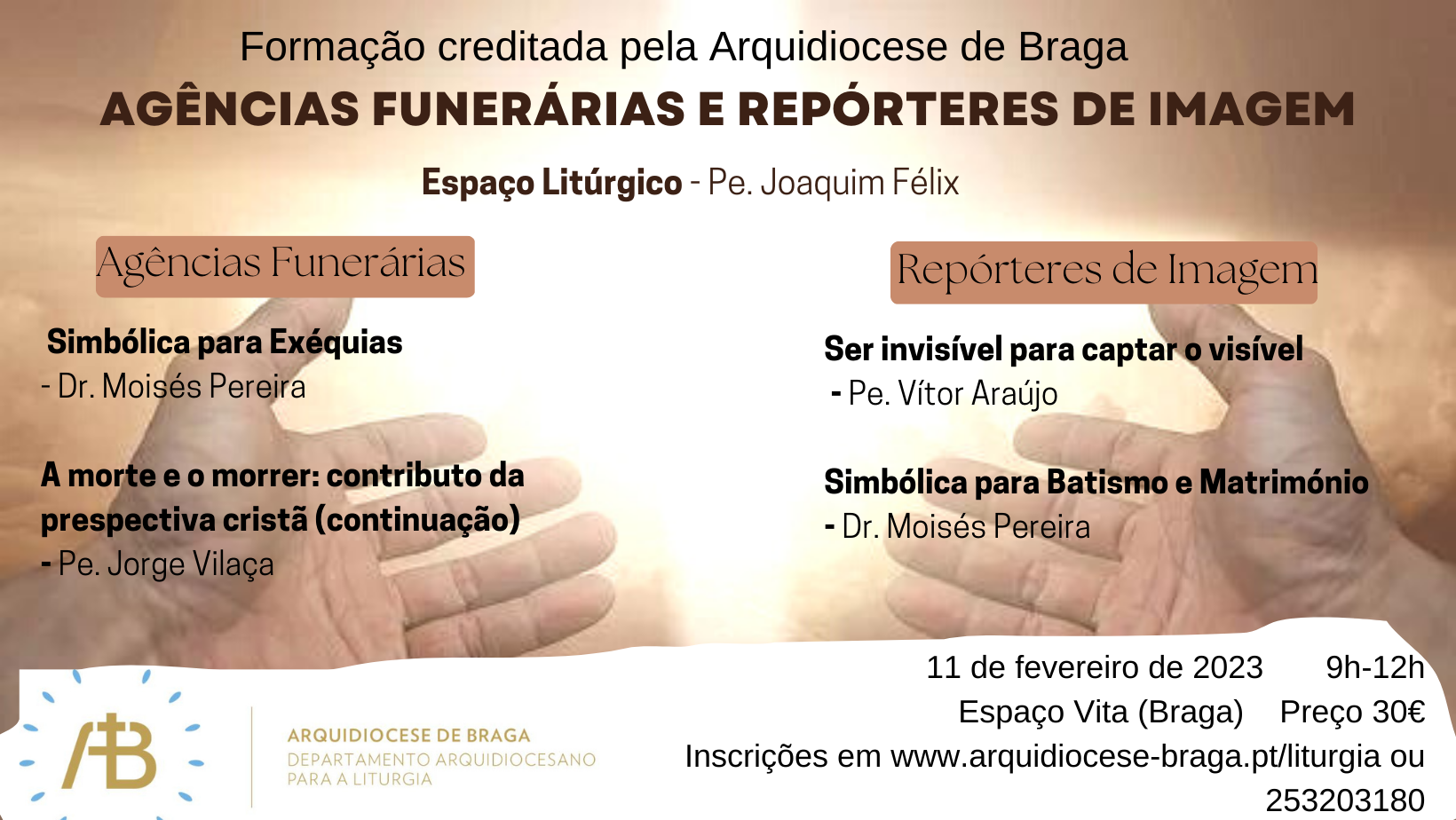 A Arquidiocese de Braga, através do Departamento para a Liturgia, propõe uma manhã de formação para agências funerárias e para repórteres de imagem, que prestam serviço na Liturgia. Esta formação acontecerá no dia 11 de fevereiro, sábado, no Espaço Vita,