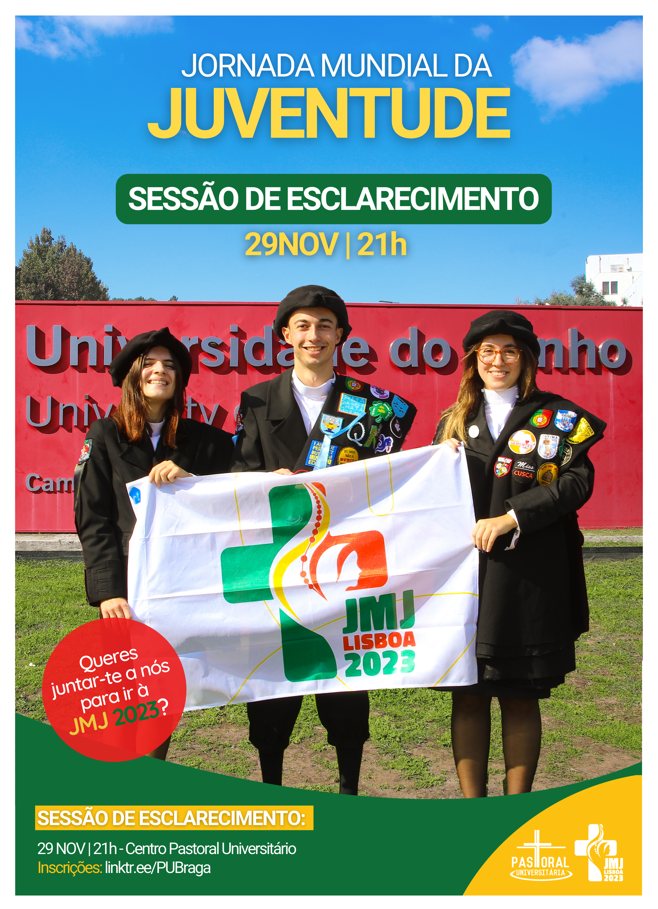 A Pastoral Universitária de Braga (PUB) promove no próximo dia 29 de novembro, às 21h, uma sessão de esclarecimento sobre a Jornada Mundial da Juventude (JMJ) Lisboa 2023 . O evento será no Centro Pastoral Universitário (CPU).