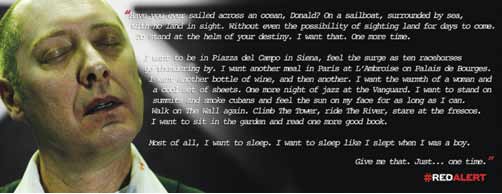 A câmara aproxima-se lentamente do rosto de “Red” até dar um grande plano aos seus grandes planos. A banda sonora, em fundo, apoia e acentua o dramático da cena. O monólogo de Reddington é a palavra de quem se encontrou há muito, discurso de despedida de alguém que se conhece profundamente. Qualquer pessoa que saiba minuciosamente o que quer fazer nos instantes derradeiros (minutos, dias, meses) é pessoa que profundamente se conhece. E quem se conhece já se encontrou – no momento em que se conheceu. No caso de “Red”, aquilo são os desejos de quem correu mundo e o tem todo lá dentro. Grande James Spader,como é que não te deram o Emmy???