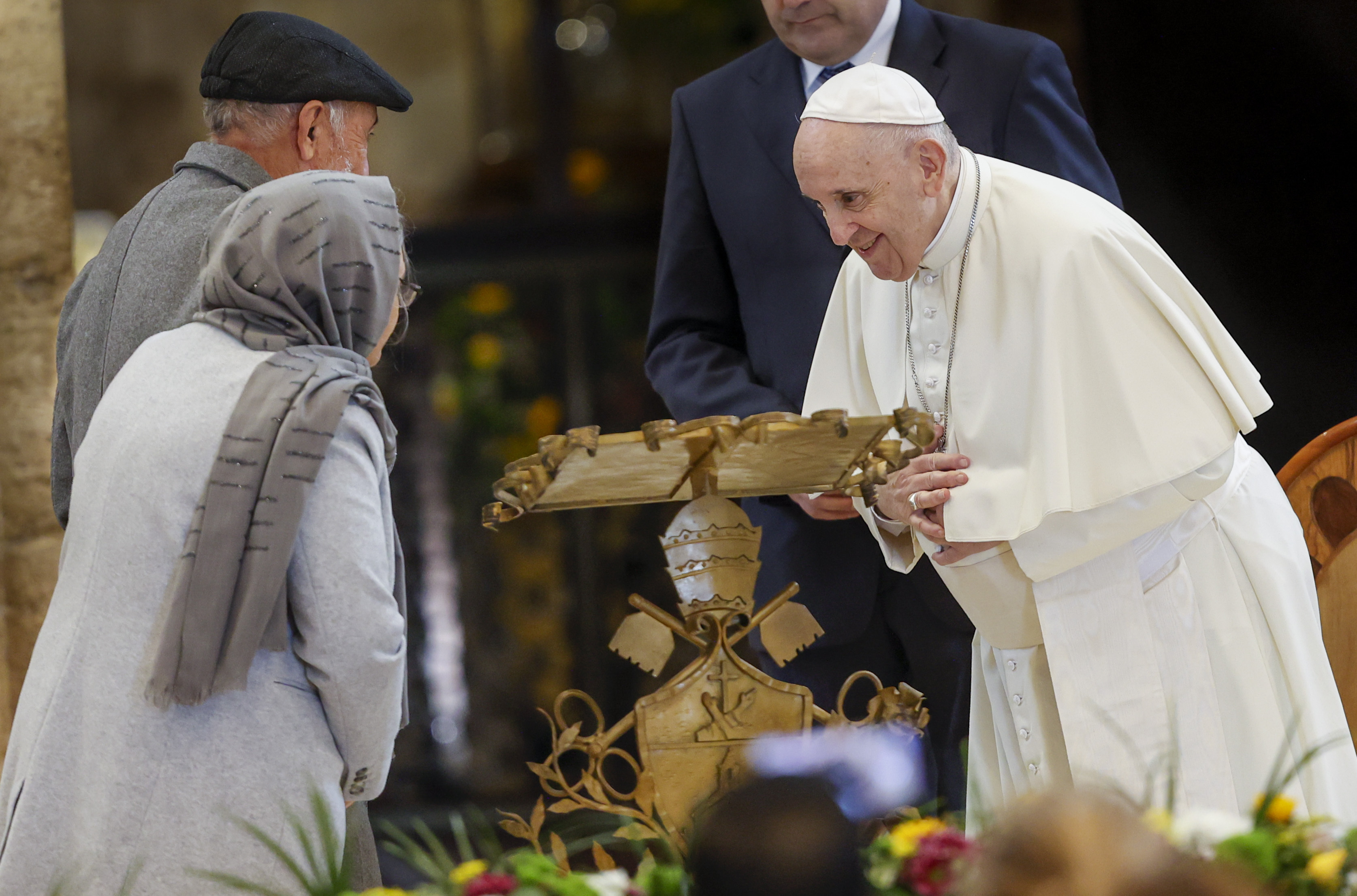 O encontro de oração e testemunho começou com um “abraço” virtual no átrio da Basílica de Santa Maria dos Anjos, onde o Papa recebeu simbolicamente o manto e o cajado do Peregrino. O cajado foi entregue por Abrhaley, refugiado eritreu invisual, que chegou à Itália em 2018 graças à criação dos corredores humanitários.