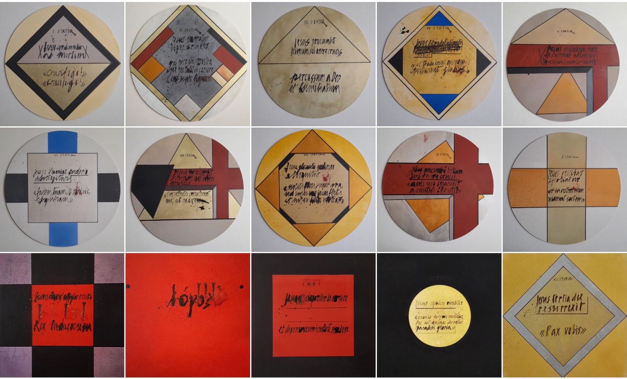 Neste contexto, ousei propor ao artista a criação de uma Via Sacra do Logos, que logo foi acolhida com entusiasmo. A escolha operativa orientou-se para a abstração, eliminando as formas figurativas tradicionais. Uma preparação preliminar: o ditado de fragmentos bíblicos e evangélicos em latim para serem inseridos sob a forma de manuscrito nas quinze telas previstas.