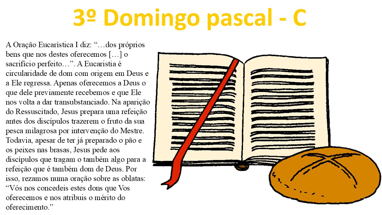 V/Senhor Jesus ressuscitado, que nas margens do mar da Galileia preparastes a refeição para os apóstolos, partilhai connosco o vosso amor e conduzi-nos ao festim da eternidade. Vós que viveis e reinais por todos os séculos dos séculos.
