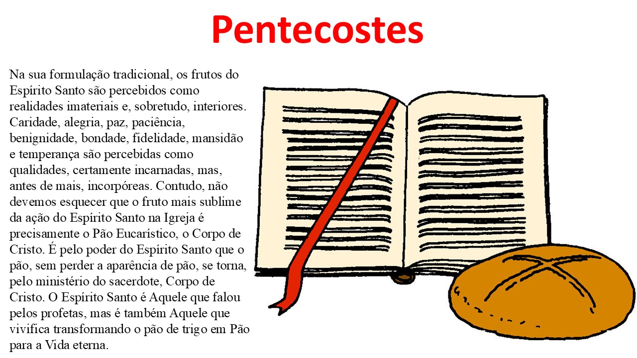 Na sua formulação tradicional, os frutos do Espírito Santo são percebidos como realidades imateriais e, sobretudo, interiores. Caridade, alegria, paz, paciência, benignidade, bondade, fidelidade, mansidão e temperança são percebidas como qualidades, certamente incarnadas, mas, antes de mais, incorpóreas. Contudo, não devemos esquecer que o fruto mais sublime da ação do Espírito Santo na Igreja é precisamente o Pão Eucarístico, o Corpo de Cristo. É pelo poder do Espírito Santo que o pão, sem perder a aparência de pão, se torna, pelo ministério do sacerdote, Corpo de Cristo. O Espírito Santo é Aquele que falou pelos profetas, mas é também Aquele que vivifica transformando o pão de trigo em Pão para a Vida eterna.