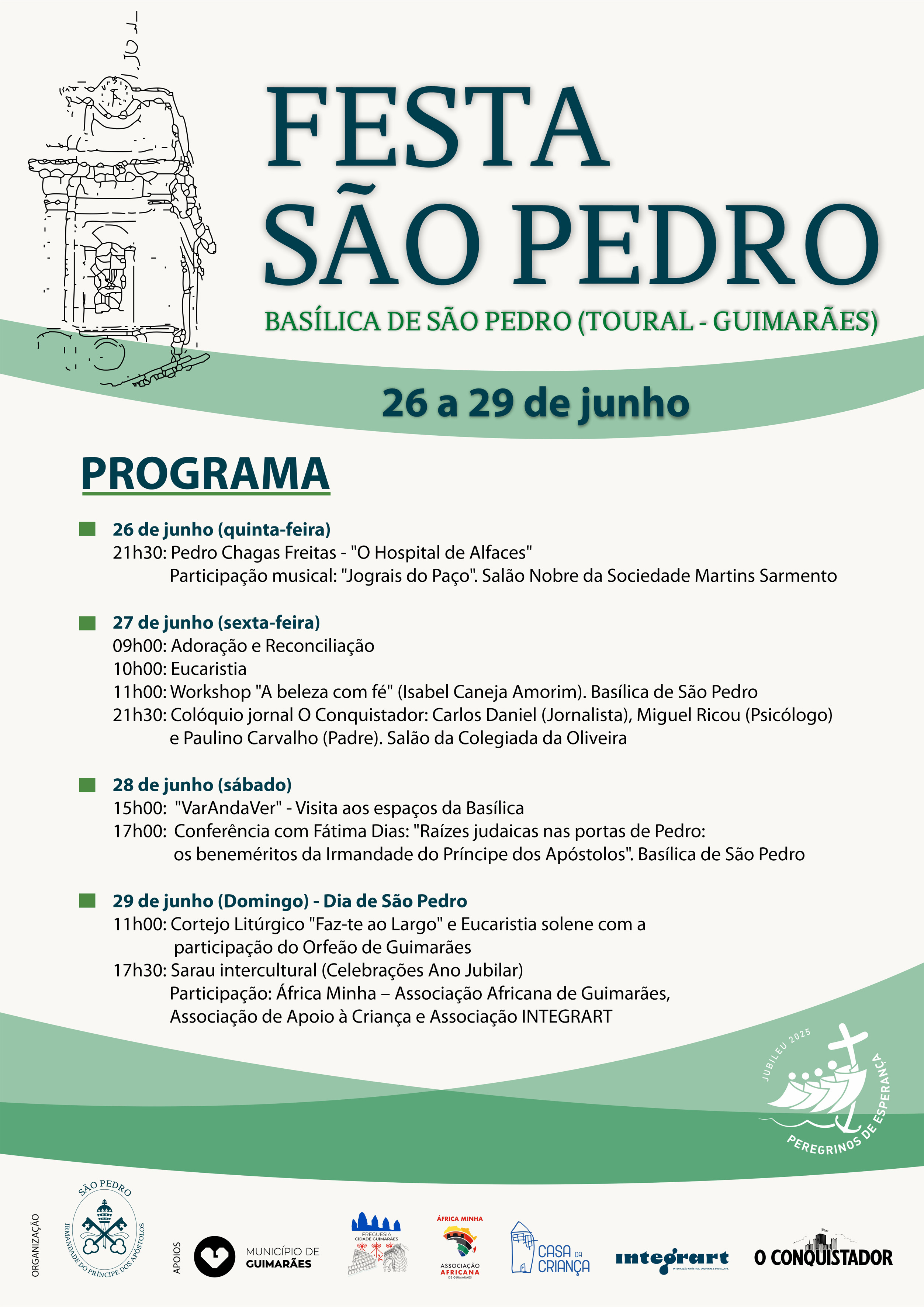 As celebrações culminam no domingo, dia 29, dia de São Pedro, com um Cortejo Litúrgico intitulado “Faz-te ao Largo”, às 11h00, seguido da Eucaristia solene animada pelo Orfeão de Guimarães. À tarde, às 17h30, a Basílica acolhe um sarau intercultural, inserido nas celebrações do Ano Jubilar, com a participação das associações África Minha, Associação de Apoio à Criança e INTEGRART.