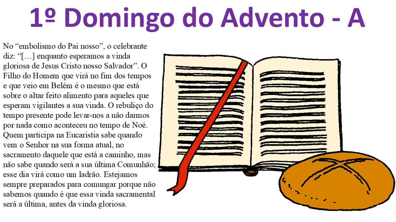 No “embolismo do Pai nosso”, o celebrante diz: “[…] enquanto esperamos a vinda gloriosa de Jesus Cristo nosso Salvador”. O Filho do Homem que virá no fim dos tempos e que veio em Belém é o mesmo que está sobre o altar, feito alimento para aqueles que esperam vigilantes a sua vinda. O rebuliço do tempo presente pode levar-nos a não darmos por nada como aconteceu no tempo de Noé. Quem participa na Eucaristia sabe quando vem o Senhor na sua forma atual, no sacramento daquele que está a caminho, mas não sabe quando será a sua última Comunhão; esse dia virá como um ladrão. Estejamos sempre preparados para comungar, porque não sabemos quando é que essa vinda sacramental será a última, antes da vinda gloriosa.