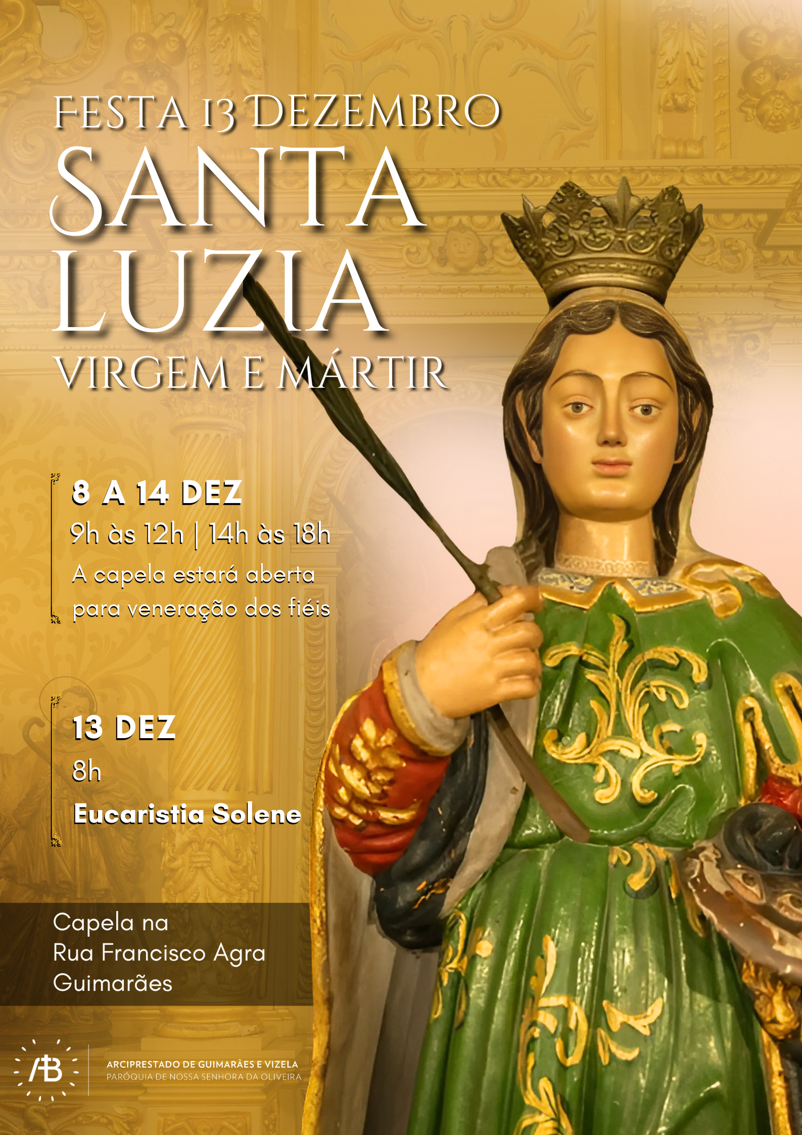 Santa Luzia, cujo nome deriva de "luz", é invocada há séculos como protetora dos olhos e da vista, sendo o dia 13 de Dezembro uma data de forte devoção em Guimarães e por todo o país. A Paróquia convida todos os fiéis e a comunidade a participar nestes momentos de fé e recolhimento.