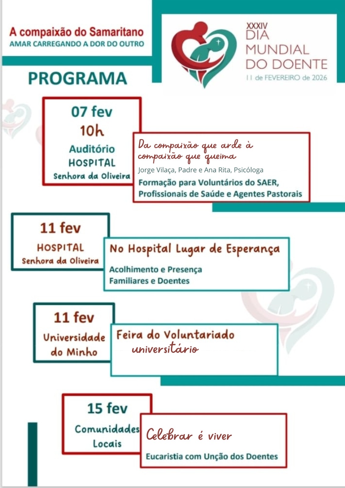 - 11 de Fevereiro (Hospital): O Hospital Senhora da Oliveira transforma-se num "Lugar de Esperança", com ações de acolhimento e proximidade dedicadas a doentes e famílias.