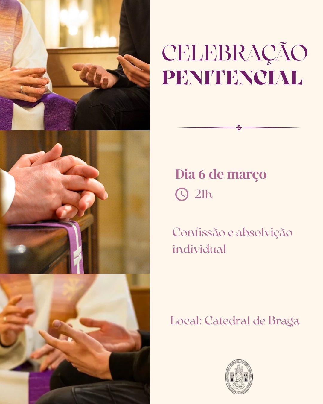 A Sé Primacial de Braga acolhe, na próxima sexta-feira, dia 6 de março, a partir das 21h, uma celebração penitencial comunitária, aberta e dirigida aos bracarenses e quantos vivem no território.