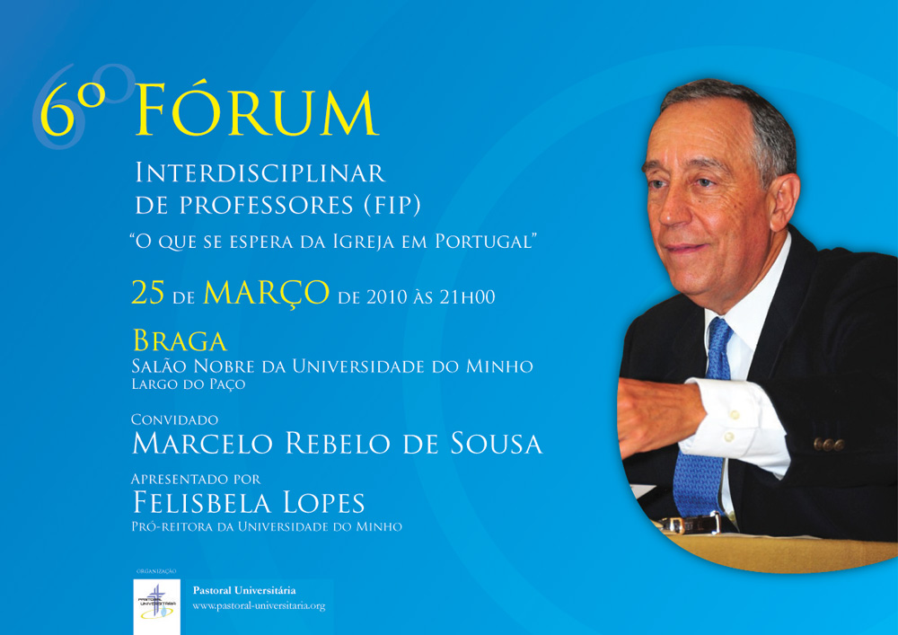 O Salão Nobre da Universidade do Minho, no Largo do Paço, em Braga, acolhe na próxima quinta-feira, 25 de Março, pelas 21h, o VI FIP - Fórum Interdisciplinar de Professores. Vai ter como orador convidado o Prof. Marcelo Rebelo de Sousa.